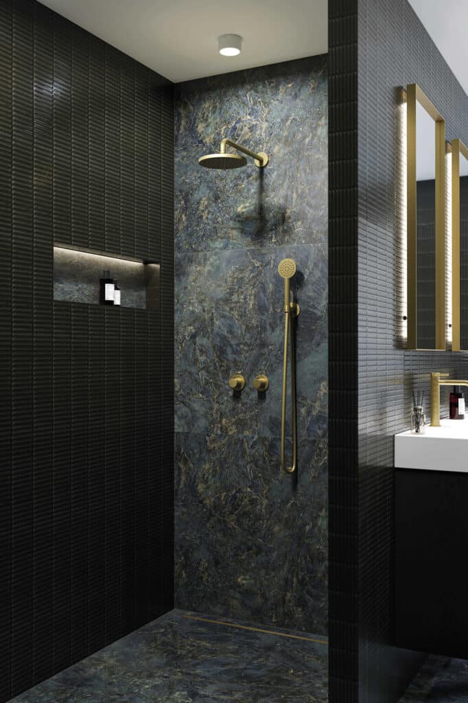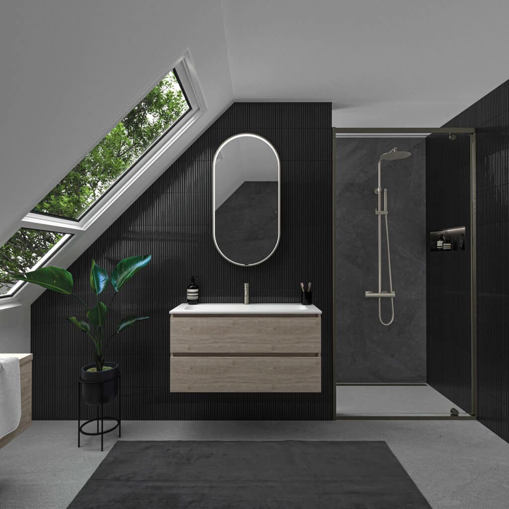 In Bemmel mochten we deze prachtige badkamer leveren met organische spiegel inclusief indirecte dimbare verlichting en verwarming, kranen in Gun Metal, wastafelmeubel met bijpassend bankje van Laguna met bijpassend bankje. De vloertegels zijn van het Italiaanse topmerk Atlas Concorde.